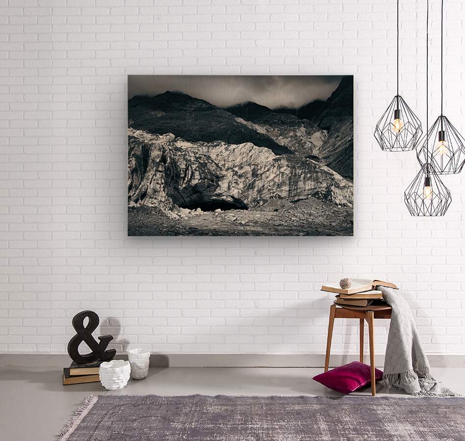 The entrance to an ice cave at Fox Glacier in New Zealand surrounded by towering rugged mountains their peaks disappearing into low lingering clouds. The glacier’s textured surface and the dramatic contrast between the ice and rock create a scene that feels both powerful and remote. This photograph captures the essence of New Zealand’s wild alpine landscapes making it a great choice for those who appreciate the striking beauty of untamed natural environments.