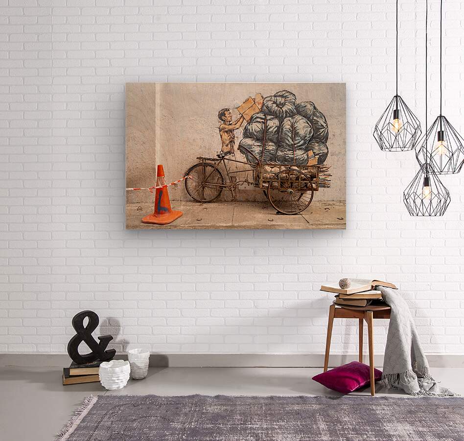 A wall mural in Ipoh Malaysia creatively blending art with reality. A painted man struggles to balance an overloaded tricycle piled high with goods wh...[+]