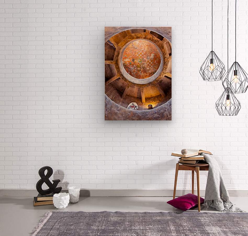 A view looking up inside the historic Desert View Watchtower near the east entrance of Grand Canyon National Park Arizona. The walls are adorned with Navajo-inspired murals their shapes and symbols reaching toward the circular opening above. Natural light filters through the tower casting a warm glow that enhances the earthy tones and textures of the artwork. A great photograph for those interested in Native American culture historic architecture and the deeper stories within the Grand Canyon landscape.