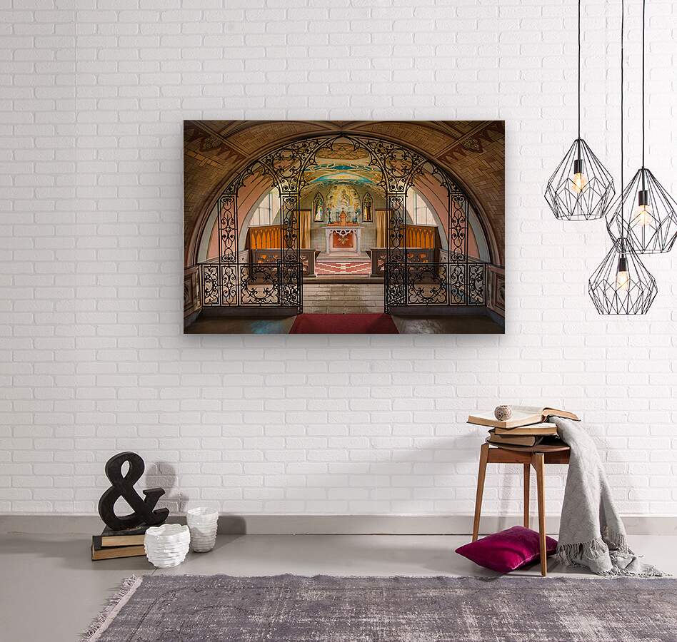 An interior view of the Italian Chapel on Lamb Holm Orkney showing the ornate ironwork and carefully crafted altar. Built during World War II by Italian prisoners of war held on the island the chapel was constructed from two Nissen huts transformed with remarkable ingenuity into a place of worship. The delicate details including the wrought iron railings and painted interior reflect both devotion and resilience in a time of hardship. A perfect photograph for those drawn to places with rich history and quiet enduring beauty.