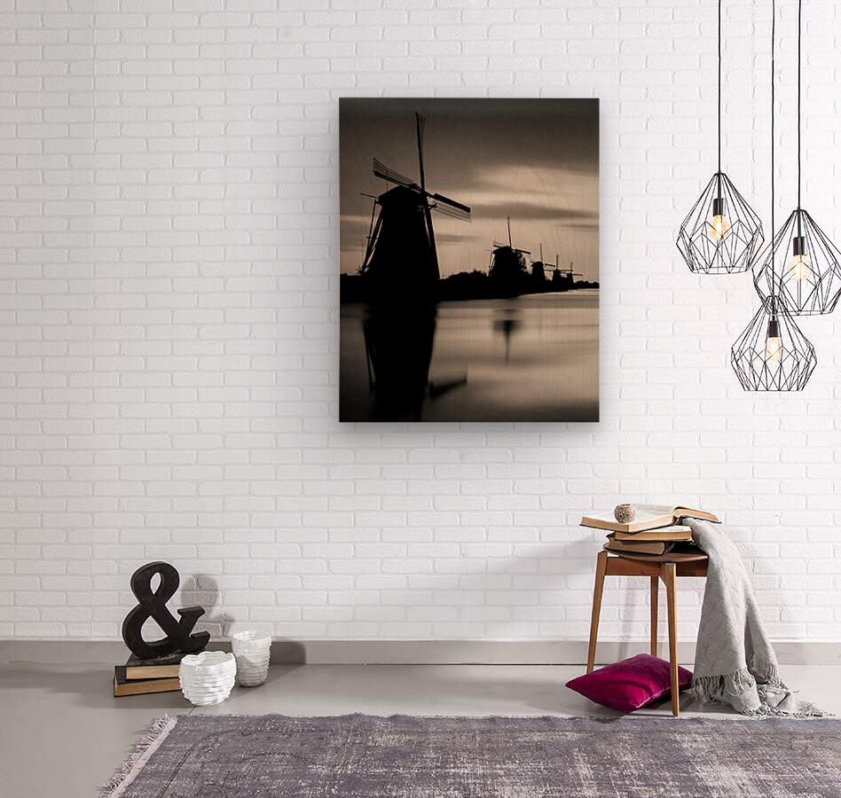 A row of traditional Dutch windmills stands in silhouette at Kinderdijk captured just before sunrise. Rendered in monochrome the scene has a quiet contemplative quality with smooth water in the foreground reflecting the dark forms of the nearest mill. Soft streaked clouds stretch across the sky diffusing the early morning light and adding subtle tonal contrast to the stillness below. Kinderdijk is a UNESCO World Heritage Site and one of the most iconic landscapes in the Netherlands. These historic windmills once vital for managing water levels in the low-lying polder now form a striking symbol of Dutch ingenuity. In this long exposure time seems to pause—the sky and water blur to softness while the windmills remain still and solid their angular shapes cutting clearly through the dawn light. This piece offers a minimalist yet dramatic impression of Dutch heritage and is available as wall art in various formats to suit modern or traditional interiors.
